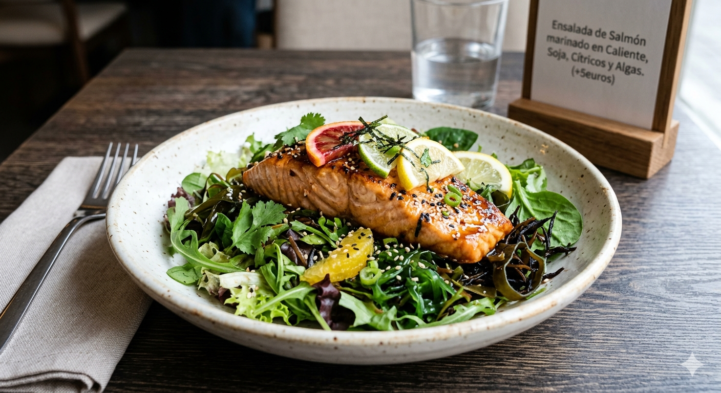 Ensalada de Salmón marinado en Caliente, Soja, Cítricos y Algas. (+5euros)
