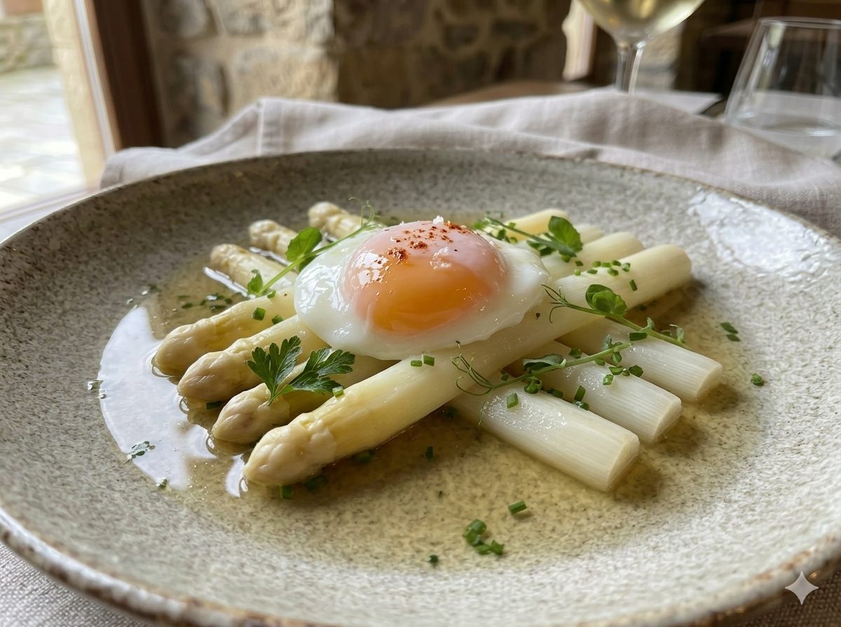 Espárragos blancos de Navarra con Huevo escalfado en su caldo de Cocción. (+5 euros)