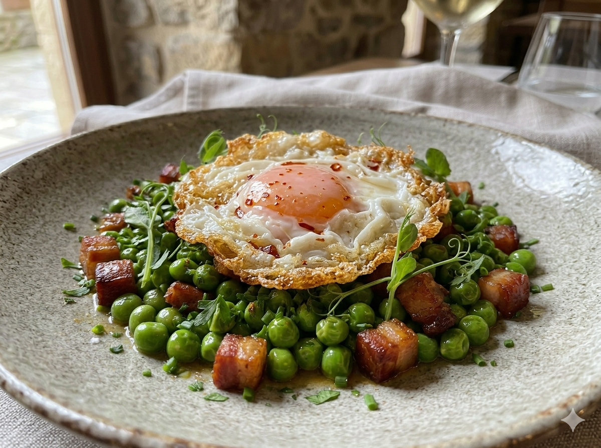 Guisantes salteados con Panceta “Maskarada” y Huevo frito