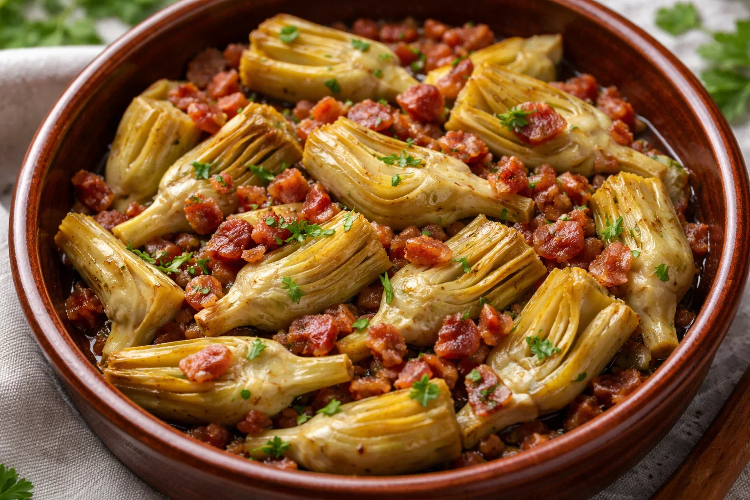 Alcachofas estofadas de manera tradicional con Jamón Ibérico. (+3 euros)